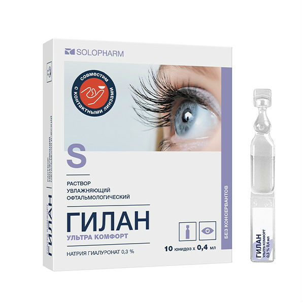 При систематическом ношении контактных линз рекомендуется применение офтальмологического раствора Гилан Ультра комфорт, который способствует длительному увлажнению глаза, так как его действие идентично натуральной слезной жидкости. Офтальмологический раствор Гилан Ультра комфорт не содержит консервантов, поэтому отсутствует нежелательное токсическое действие на ткани глаза. Раствор имеет показатель вязкости 9,0 - 18,0 мПа·с.