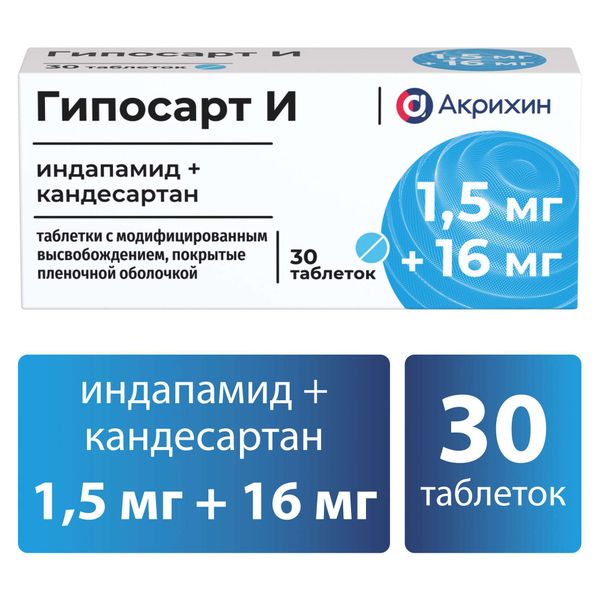 Препарат Гипосарт ;И является комбинацией двух компонентов для понижения артериального давления с дополняющим друг друга механизмом контроля артериального давления у пациентов с повышенным артериальным давлением: ;индапамид ;— мочегонный компонент и ;кандесартан ;— компонент для снижения артериального давления (АД). Комбинация этих компонентов приводит к более выраженному снижению АД по сравнению с таковым на фоне отдельного лечения каждым препаратом.