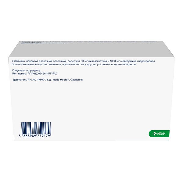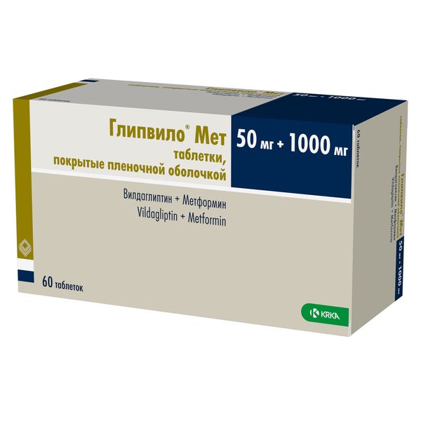 Каждая таблетка содержит 50 мг вилдаглиптина и 1000 мг метформина гидрохлорида.