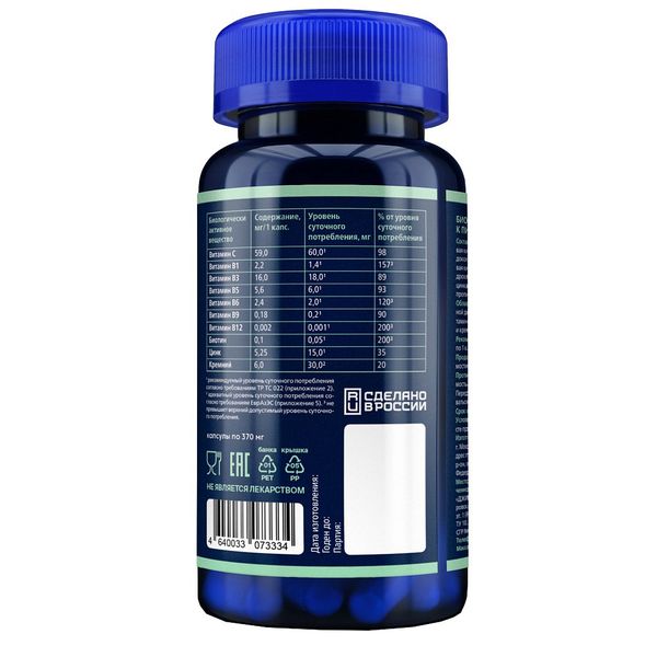 Премикс витаминный (лактоза, L-аскорбиновая кислота, никотинамид, кальция пантотенат, пиридоксина гидрохлорид, тиамина гидрохлорид, фолиевая кислота, биотин, цианокобаламин), L-лизина гидрохлорид, L-пролин, антислеживающий агент тальк, цинка сульфат, кремния диоксид, капсула (гидроксипропилметилцеллюлоза).