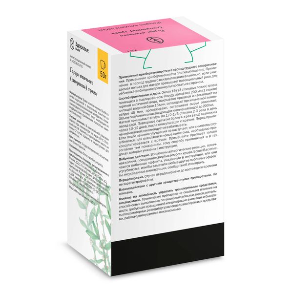 Настой горца птичьего (спорыша) травы препятствует образованию мочевых камней (уратов). Оказывает диуретическое, противовоспалительное, гемостатическое, умеренное антимикробное действие, повышает сократительную активность матки.