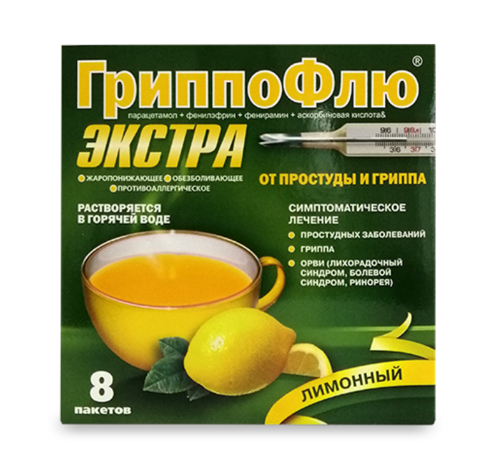 ГриппоФлю экстра от простуды и гриппа лимонный порошок для приготовления раствора для приёма внутрь пакеты 13г №8