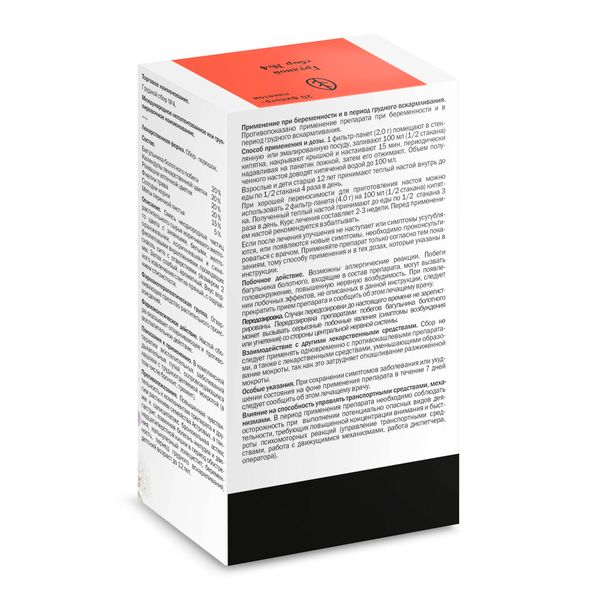 При хорошей переносимости для приготовления настоя можно использовать 2 фильтр-пакета (4,0 г) на 100 мл (½ стакана) кипятка.