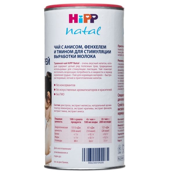"Чай для кормящих матерей" HiPP Natal – быстрорастворимый, легкий в приготовлении напиток с анисом, фенхелем и тмином. Чай содержит целый ряд полезных трав, традиционно используемых для стимуляции лактации. Напиток поддержит выработку грудного молока, поможет восполнить возросшую потребность в жидкости в период кормления грудью. Очень вкусный и ароматный напиток, который можно пить как в теплом, так и в охлажденном виде.