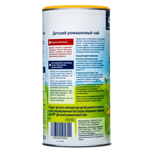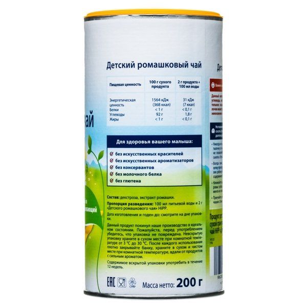 "Детский ромашковый чай" HiPP – это быстрорастворимый, легкий в приготовлении напиток с экстрактом ромашки для детей старше 4 месяцев. Ромашка хорошо известна своим успокаивающим действием, применяется как спазмолитическое и противовоспалительное средство. Чай подходит в качестве дополнительного источника жидкости в случае необходимости, например, из-за повышенного потоотделения или в период введения в рацион ребенка прикорма. Обладает приятным вкусом и ароматом.