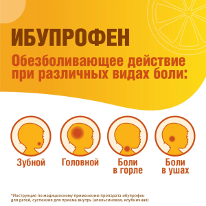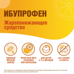 Только для кратковременного применения. Внимательно прочтите инструкцию перед приёмом препарата. Перед употреблением тщательно взболтайте флакон. 5 ;мл препарата содержат 100 ;мг ибупрофена или в ;20 ;мг ибупрофена в ;1 ;мл.