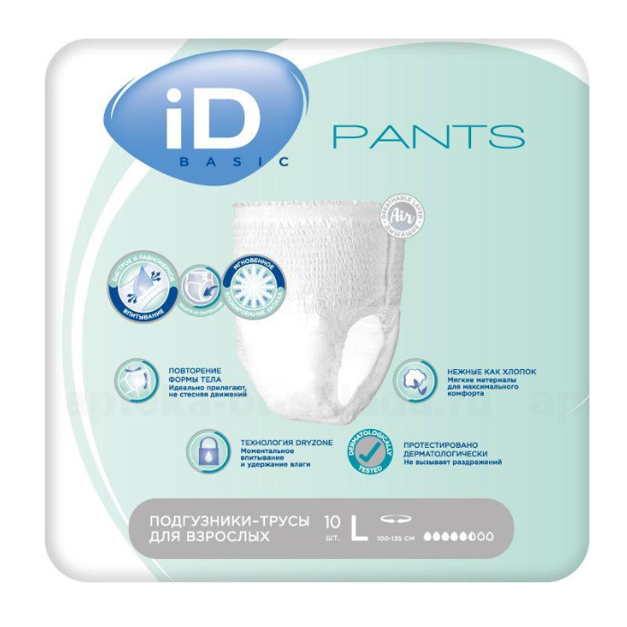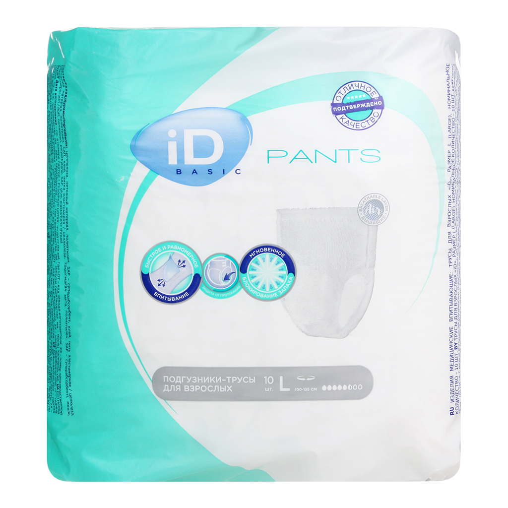 Подгузники-трусы iD PANTS напоминают обычное белье, они идеально прилегают к телу, незаметны под одеждой и не стесняют движений. Это прекрасное решение для использования при средней и тяжелой степени недержания для людей, ведущих активный образ жизни. Они обеспечивают моментальное впитывание и удержание влаги, благодаря чему кожа остается сухой, отличную защиту от протеканий и блокирование неприятных запахов. Мягкие, как хлопок, материалы дарят ощущение комфорта.