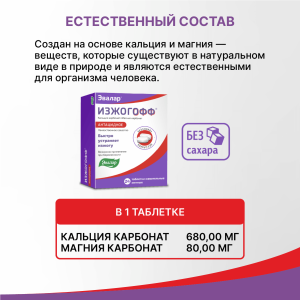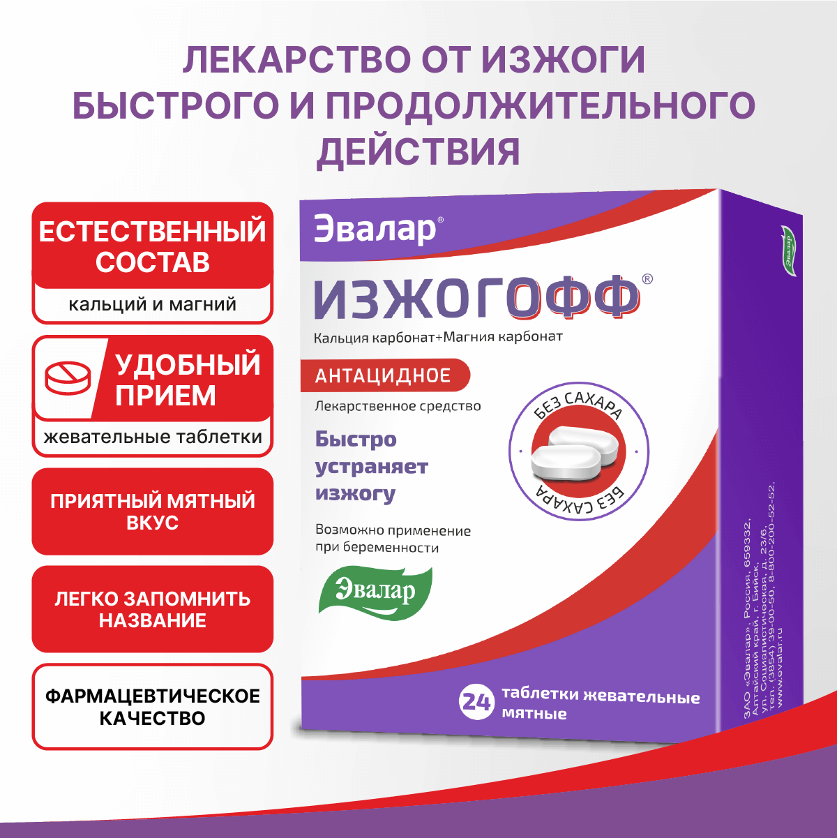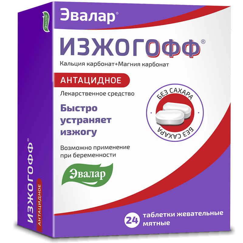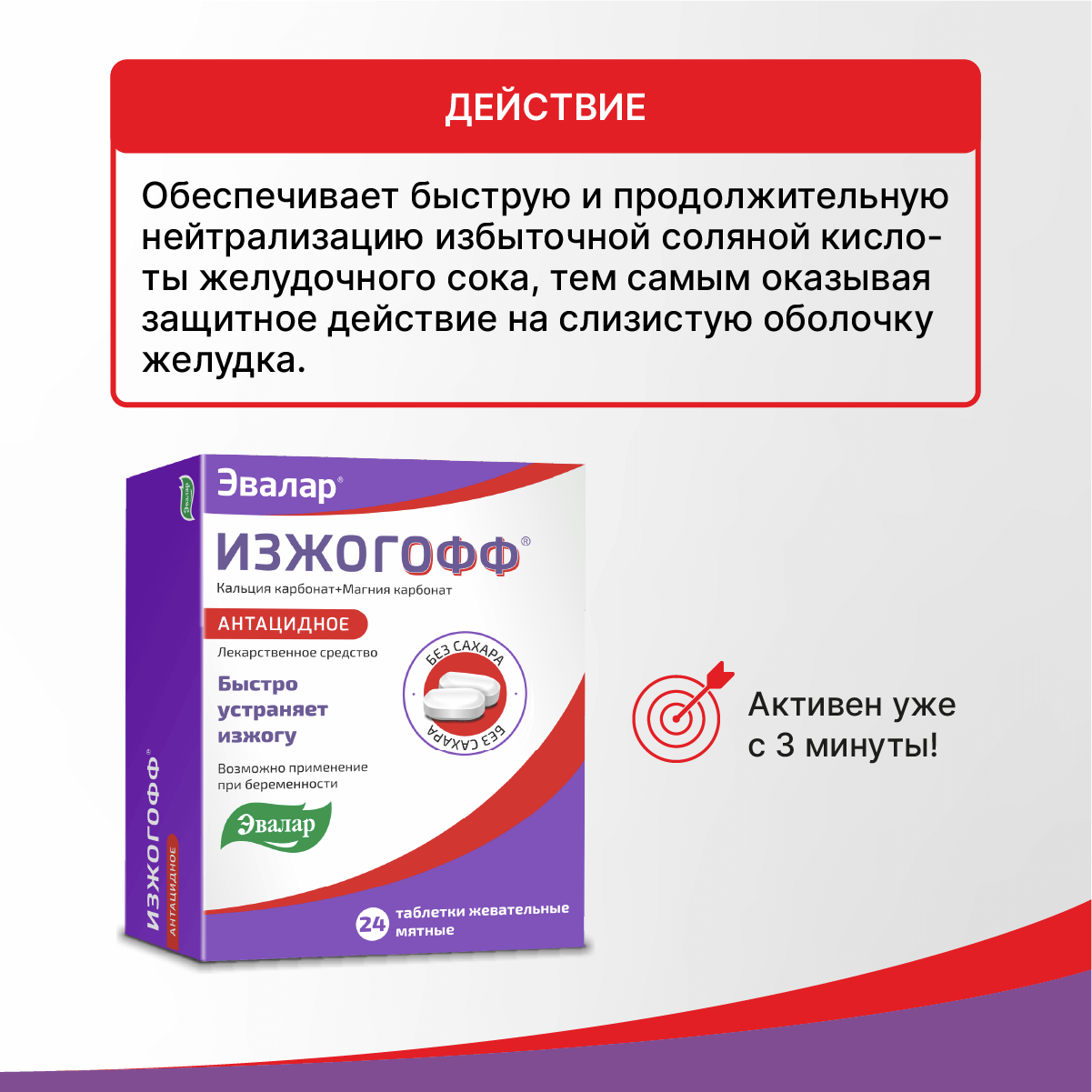 Таблетка ИЗЖОГОФФ® ;содержит антацидные вещества — кальция карбонат и магния карбонат, которые обеспечивают быструю и продолжительную нейтрализацию избыточной соляной кислоты желудочного сока, тем самым оказывая защитное действие на слизистую оболочку желудка. Достижение положительного эффекта в течение 3–5 минут обусловлено хорошей растворимостью таблеток и высоким содержанием кальция.
