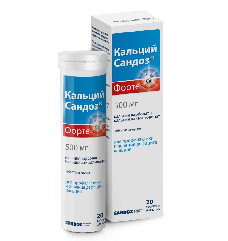 Кальций Сандоз® Форте содержит две соли кальция (кальция лактоглюконат и кальция карбонат), которые в форме таблеток шипучих быстро растворяются в воде, превращаясь в активную ионизированную форму кальция, которая легко усваивается.