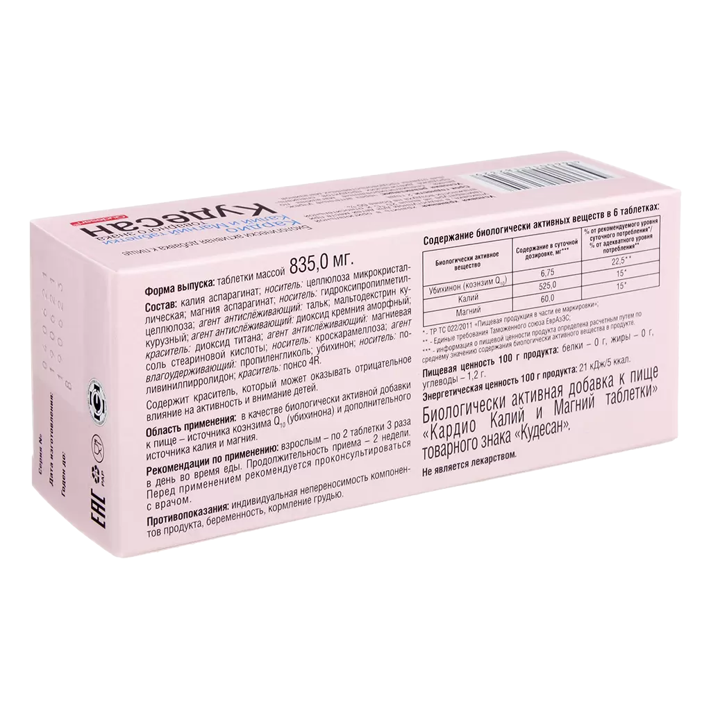 Кардио Калий и магний товарного знака Кудесан таблетки - является источником Q10, калия и магния, которые оказывают разностороннее влияние на деятельность сердца:
