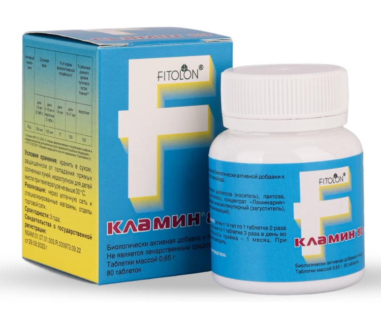 Кламин® 80 - биологически активная добавка на основе экстракта ламинарии (вырабатывается из липидной фракции бурых морских водорослей) и пищевого энтеросорбента - МКЦ. Общеукрепляющее и йодосодержащее средство. Кламин® 80 содержит в естественном состоянии все ценные компоненты ламинарии: йод, калий, кальций, железо, селен, магний, цинк, фосфор и другие макро- и микроэлементы, полиненасыщенные жирные кислоты омега-3, хлорофилл, растительные стерины, полисахариды. Кламин® 80 нормализует активность щитовидной железы. Оказывает положительное действие у пациентов с эндемическим зобом. Кламин® 80 является средством для борьбы с дефицитом йода. В 1 таблетке Кламин® 80 содержится 50 мкг йода. Прием 2-3 таблеток удовлетворяет суточную потребность в йоде. Кламин® 80 оказывает онкопротективный эффект у пациентов с предраковыми заболеваниями и болезнями, повышающими онкологический риск.