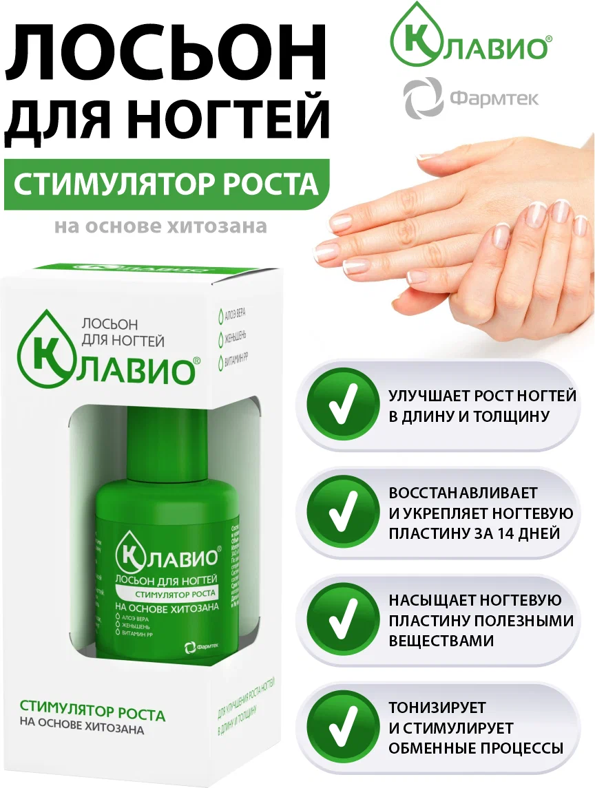 Основой лосьона КЛАВИО является водорастворимый хитозан– биологический полимер, способствующий выравниванию структуры ногтевой пластины и защищающий ее от проникновения внешних агрессивных веществ и потери влаги.