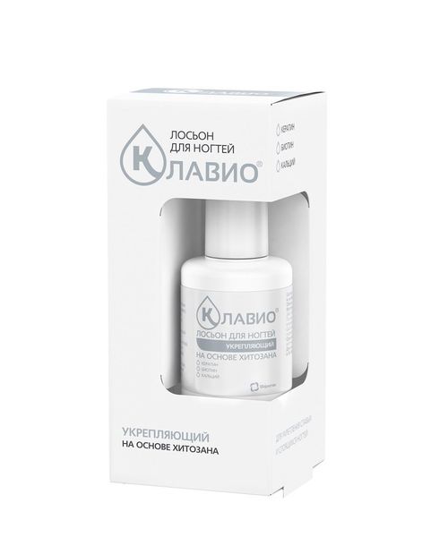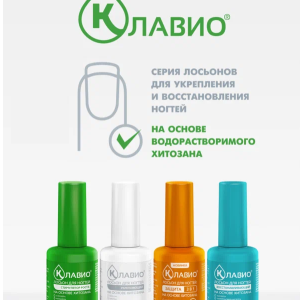 Основой лосьона КЛАВИО является водорастворимый хитозан – биологический полимер, способствующий выравниванию структуры ногтевой пластины и защищающий ее от проникновения внешних агрессивных веществ и потери влаги.