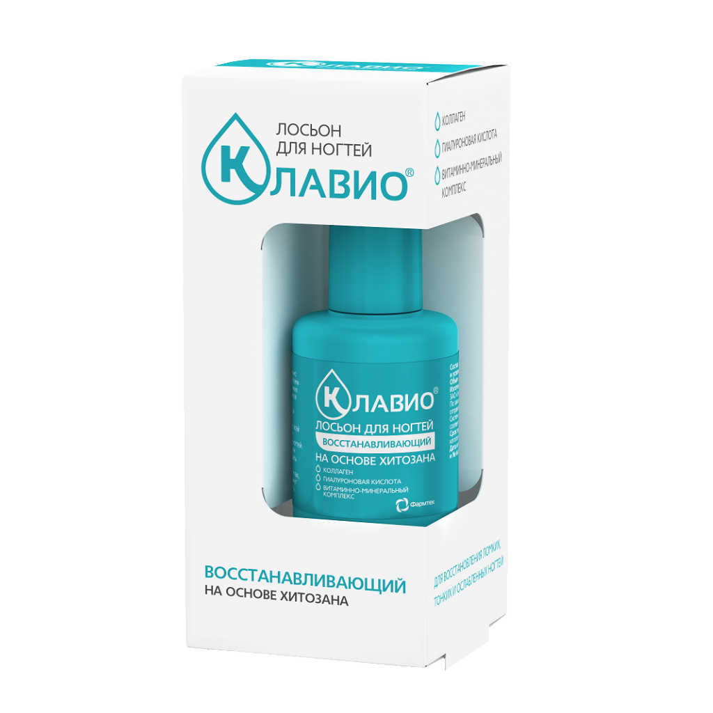 Основой лосьона КЛАВИО является водорастворимый хитозан – биологический полимер, способствующий выравниванию структуры ногтевой пластины и защищающий ее от проникновения внешних агрессивных веществ и потери влаги.