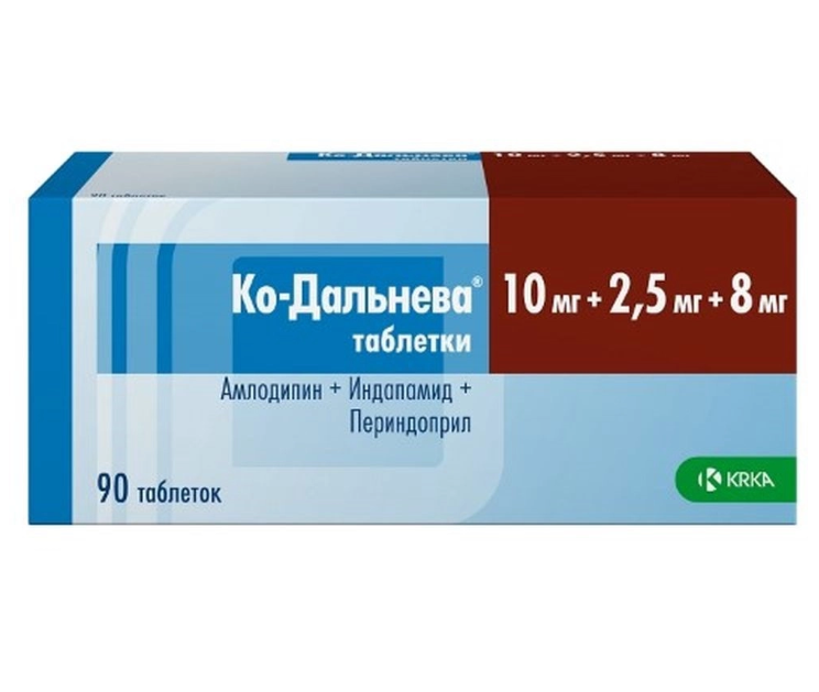 Ко-Дальнева® — комбинированный препарат, содержащий периндоприла эрбумин (ингибитор ангиотензинпревращающего фермента (А11Ф)), индапамид (тиазидоподобный диуретик) и амлодипин (блокатор «медленных» кальциевых каналов (ВМКК)).