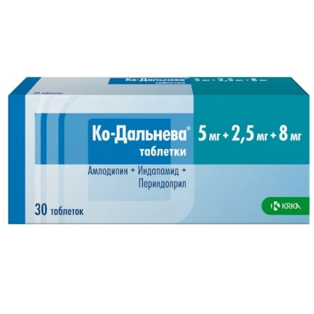 Ко-Дальнева® — комбинированный препарат, содержащий периндоприла эрбумин (ингибитор ангиотензинпревращающего фермента (А11Ф)), индапамид (тиазидоподобный диуретик) и амлодипин (блокатор «медленных» кальциевых каналов (ВМКК)).
