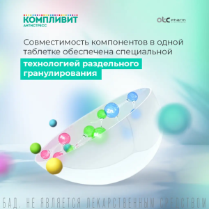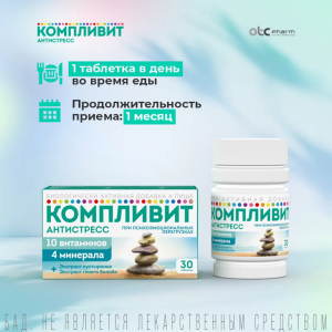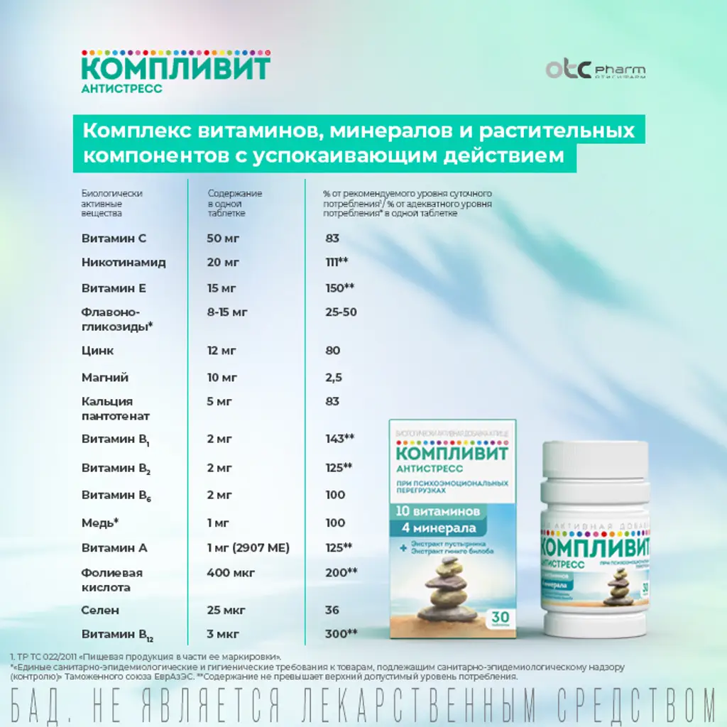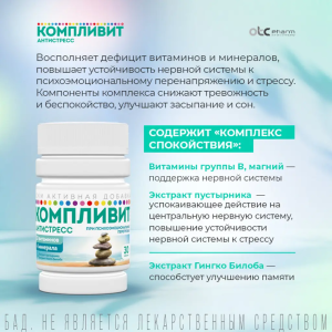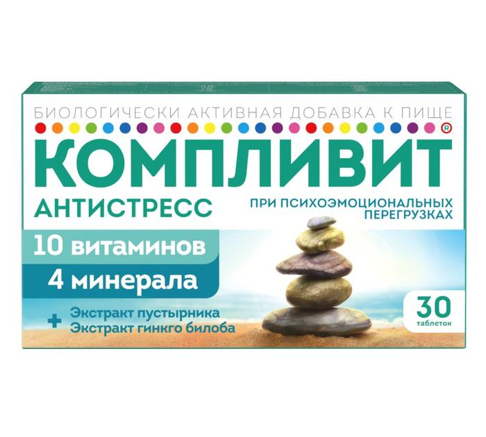 Таблетки круглой двояковыпуклой формы, покрытые оболочкой, оранжевого цвета. Научные исследования показали, что нормализация статуса питания и дотация ряда витаминов, микроэлементов в дозах, не превышающих физиологическую потребность, а также некоторых растительных компонентов очень важна при стрессе. КОМПЛИВИТ® АНТИСТРЕСС содержит экстракты пустырника и листьев гинкго билоба, а также 10 витаминов и 4 минерала, которые обеспечивают нормальную функцию нервных клеток. КОМПЛИВИТ® АНТИСТРЕСС повышает устойчивость нервной системы к психоэмоциональному перенапряжению и стрессу, оказывая адаптогенное действие. Совместимость компонентов в одной таблетке обеспечена специальной технологией.