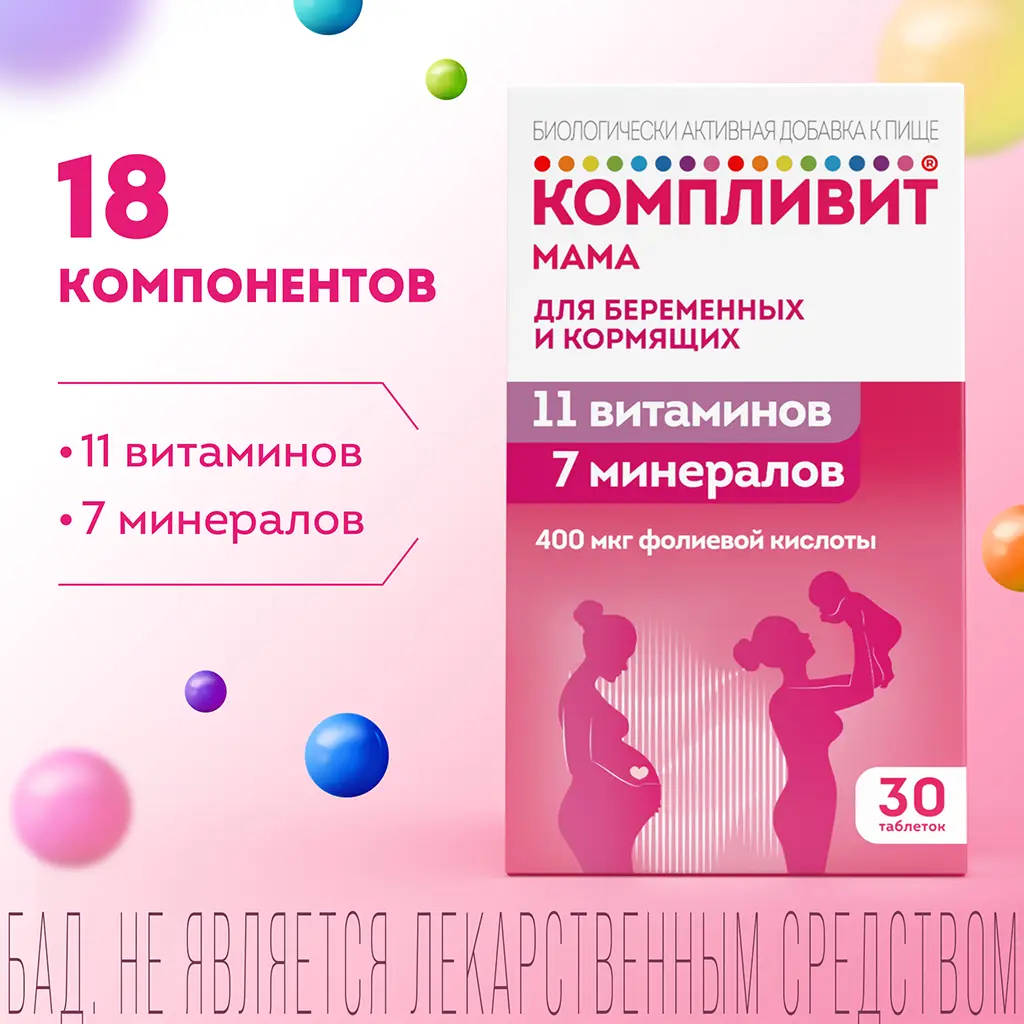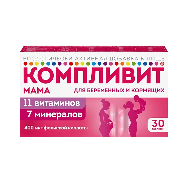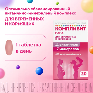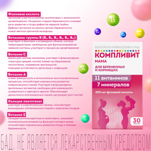 БАД «Компливит® «Мама» для беременных и кормящих» представляет собой комплекс витаминов и минералов, предназначенный для снижения риска гиповитаминоза и дефицита минеральных веществ во время беременности и грудного вскармливания.
