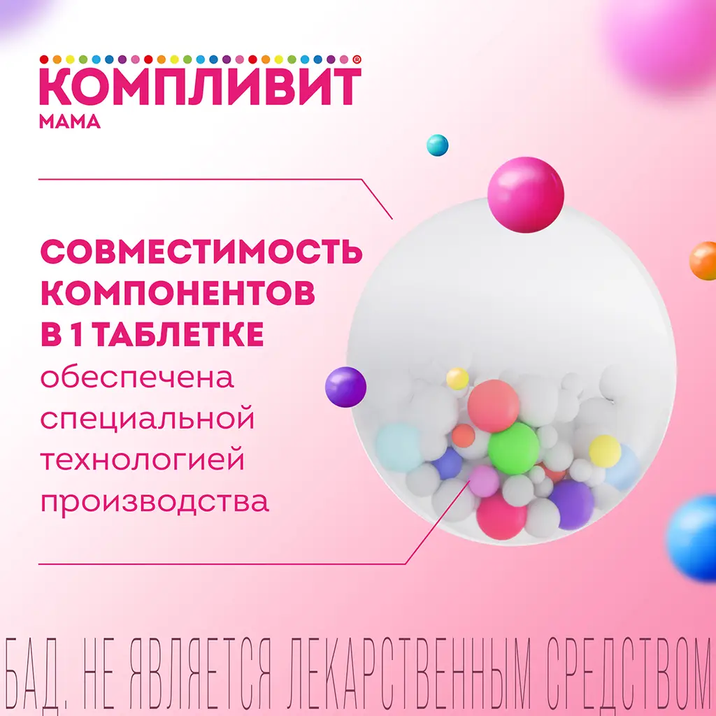 Комплекс содержит 11 витаминов, 7 минералов, данный комплекс создан с учетом потребностей женщин в витаминах и минералах во время беременности, в период кормления грудью. Совместимость компонентов, входящих в состав БАД «Компливит® «Мама» для беременных и кормящих», обеспечена специальной технологией.