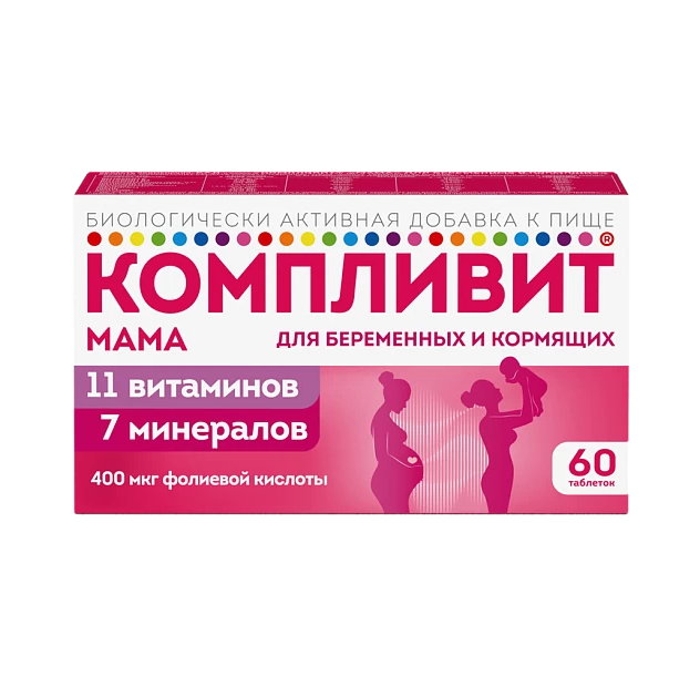 БАД «Компливит® «Мама» для беременных и кормящих» представляет собой комплекс витаминов и минералов, предназначенный для снижения риска гиповитаминоза и дефицита минеральных веществ во время беременности и грудного вскармливания.