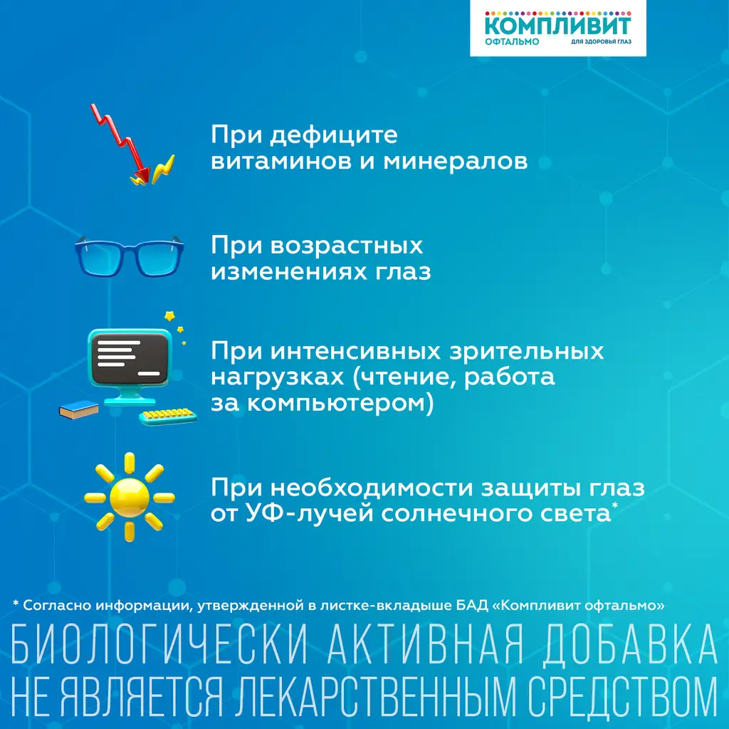 Биологически активная добавка "Компливит Офтальмо" является дополнительным источником к пище витаминов А, Е, В1, В2, В6, В12, С, фолиевой кислоты, меди, цинка, селена, источником рутина, лютеина, зеаксантина.