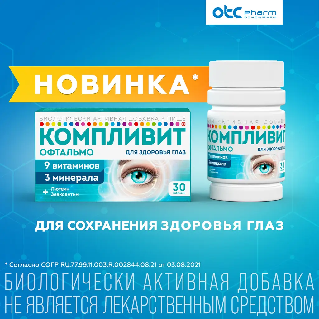 Компливит Офтальмо – комбинированное средство, содержащее комплекс витаминов, микроэлементов и растительного происхождения каротиноидов.