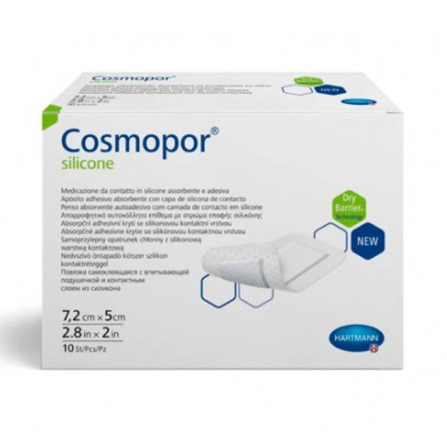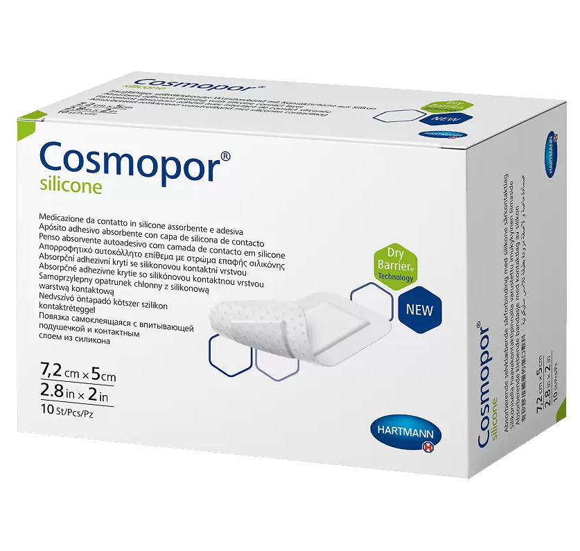 Повязка впитывающая пластырного типа с контактным слоем из силикона Cosmopor® silicone/Кocмonop силикон. Cosmopor® silicone/Кocмoпop силикон представляет собой неактивную одноразовую самоклеящуюся стерильную и полупроницаемую повязку на рану (гидроцеллюлярную тонкую повязку), состоящую из нетканого материала основы (материала-носителя) и впитывающей подушечки для раны. Обе части повязки покрыты силиконовым клеевым перфорированным слоем и защищены пленкой.