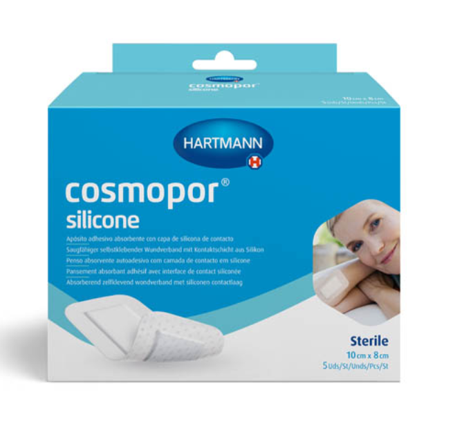 Повязка впитывающая пластырного типа с контактным слоем из силикона Cosmopor® silicone/Кocмonop силикон. Cosmopor® silicone/Кocмoпop силикон представляет собой неактивную одноразовую самоклеящуюся стерильную и полупроницаемую повязку на рану (гидроцеллюлярную тонкую повязку), состоящую из нетканого материала основы (материала-носителя) и впитывающей подушечки для раны. Обе части повязки покрыты силиконовым клеевым перфорированным слоем и защищены пленкой.
