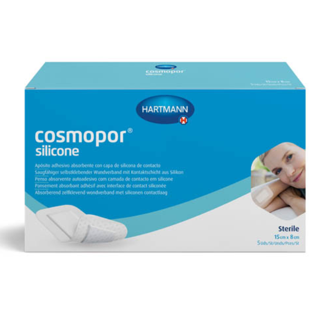 Повязка впитывающая пластырного типа с контактным слоем из силикона Cosmopor® silicone/Кocмonop силикон. Cosmopor® silicone/Кocмoпop силикон представляет собой неактивную одноразовую самоклеящуюся стерильную и полупроницаемую повязку на рану (гидроцеллюлярную тонкую повязку), состоящую из нетканого материала основы (материала-носителя) и впитывающей подушечки для раны. Обе части повязки покрыты силиконовым клеевым перфорированным слоем и защищены пленкой.