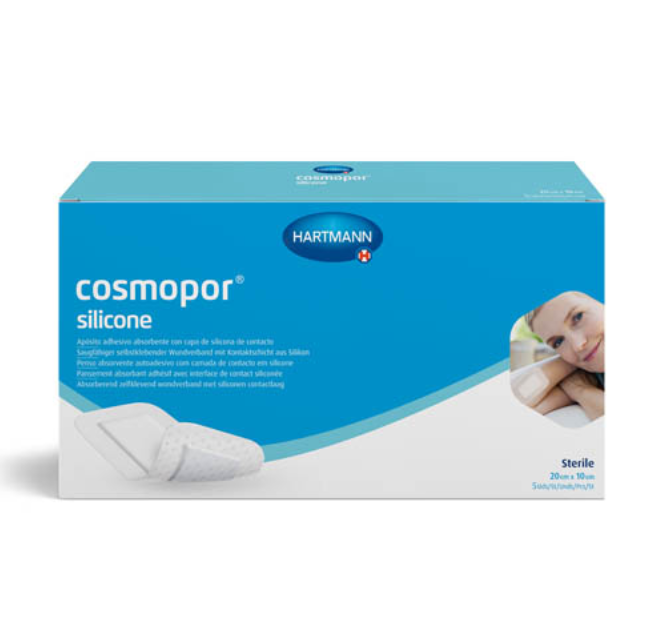 Повязка впитывающая пластырного типа с контактным слоем из силикона Cosmopor® silicone/Кocмonop силикон. Cosmopor® silicone/Кocмoпop силикон представляет собой неактивную одноразовую самоклеящуюся стерильную и полупроницаемую повязку на рану (гидроцеллюлярную тонкую повязку), состоящую из нетканого материала основы (материала-носителя) и впитывающей подушечки для раны. Обе части повязки покрыты силиконовым клеевым перфорированным слоем и защищены пленкой.