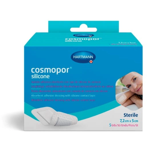 Повязка впитывающая пластырного типа с контактным слоем из силикона Cosmopor® silicone/Кocмonop силикон. Cosmopor® silicone/Кocмoпop силикон представляет собой неактивную одноразовую самоклеящуюся стерильную и полупроницаемую повязку на рану (гидроцеллюлярную тонкую повязку), состоящую из нетканого материала основы (материала-носителя) и впитывающей подушечки для раны. Обе части повязки покрыты силиконовым клеевым перфорированным слоем и защищены пленкой.