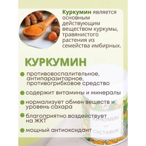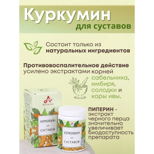 В Куркумине для суставов содержатся минералы: кальций, магний, железо, калий, фосфор, иод, микроэлементы, витамины: С, В, Е, К, флавоноиды, органические кислоты – растительного происхождения, а это легко усваивается организмом человека. Противовоспалительное и регенерирующее действие на суставы усилено добавлением экстрактов корней сабельника, коры ивы, корня имбиря, корня солодки. Уникальный состав БАДа оказывает на организм противовоспалительное, жаропонижающее, иммуностимулирующее, хондропротекторное действие (восстановление хрящевой ткани суставов). В практической медицине используют при артрозах, артритах, остеохондрозах и проблемах с позвоночником. Биодоступность БАД Куркумин для суставов многократно увеличена экстрактом черного перца.