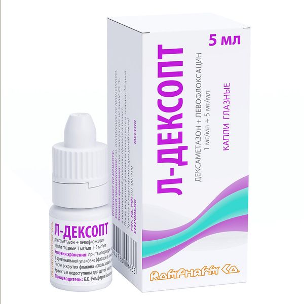 действующие вещества: дексаметазона фосфат — 1,000 мг (в пересчёте на дексаметазона фосфат натрия — 1,0925 мг), левофлоксацин — 5,000 мг (в пересчёте на левофлоксацина гемигидрат — 5,120 мг)