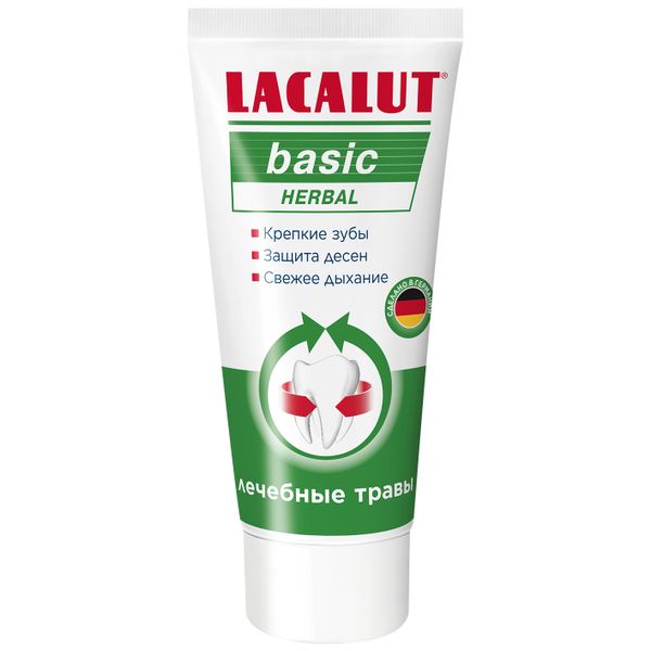 Зубная паста LACALUT basic herbal обеспечивает ежедневную защиту зубов и десен. Эфирные масла листьев эвкалипта, семян бадьяна, травы мяты и листьев шалфея ухаживают за деснами. Лактат алюминия и антисептик укрепляют десны и предотвращают их кровоточивость. Фторид защищает от кариеса и способствует реминерализации зубной эмали. Эфирные масла обеспечивают свежесть дыхания.
