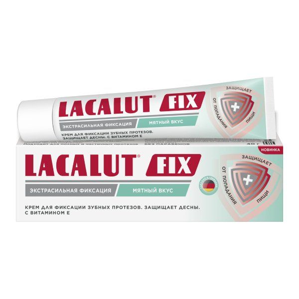 Крем для фиксации зубных протезов Lacalut Fix с мятным вкусом обеспечивает на 90% более сильную фиксацию, чем обычный крем*. Витамин Е ухаживает за деснами, жидкий парафин и вазелин увлажняют слизистые, а вяжущий компонент делает десны менее рыхлыми. Подходит для полных и частичных зубных протезов.
