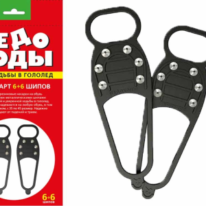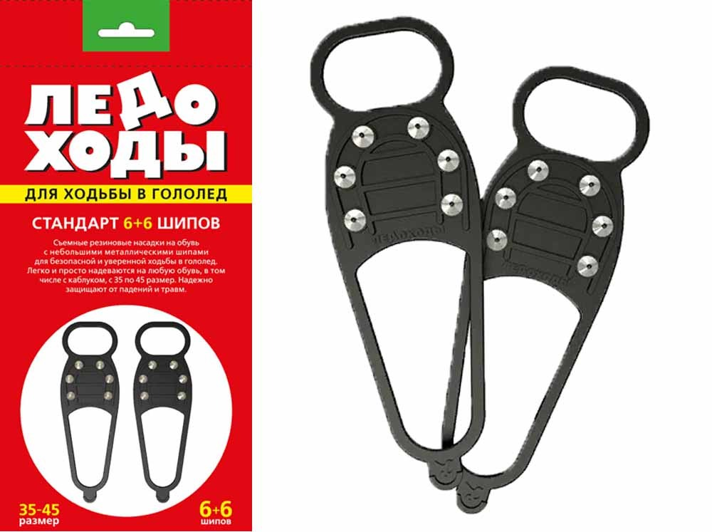 Ледоходы Стандарт 6+6 шипов фиксируются на обуви при помощи двух резиновых петель – меньшая петля надевается на носок обуви, большая - на пятку. Рекомендованы всем, но, в первую очередь, людям с ослабленными и нарушенными функциями опорно-двигательного аппарата, и особенно для пожилых людей и инвалидов.