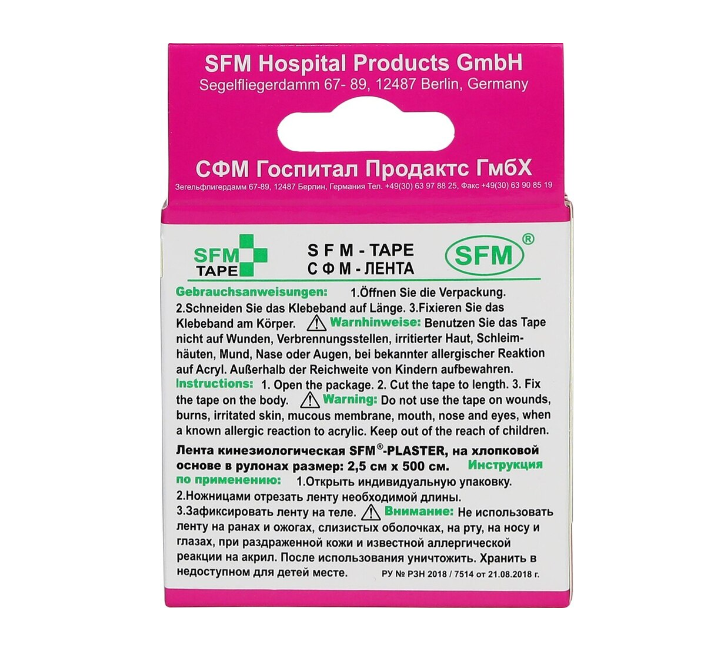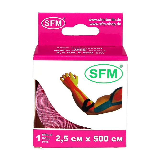 Лейкопластырь кинезио тейп SFM 2,5 см Х 500 см, представляет собой эластичную хлопковую ленту на клейкой гипоаллергенной основе.
