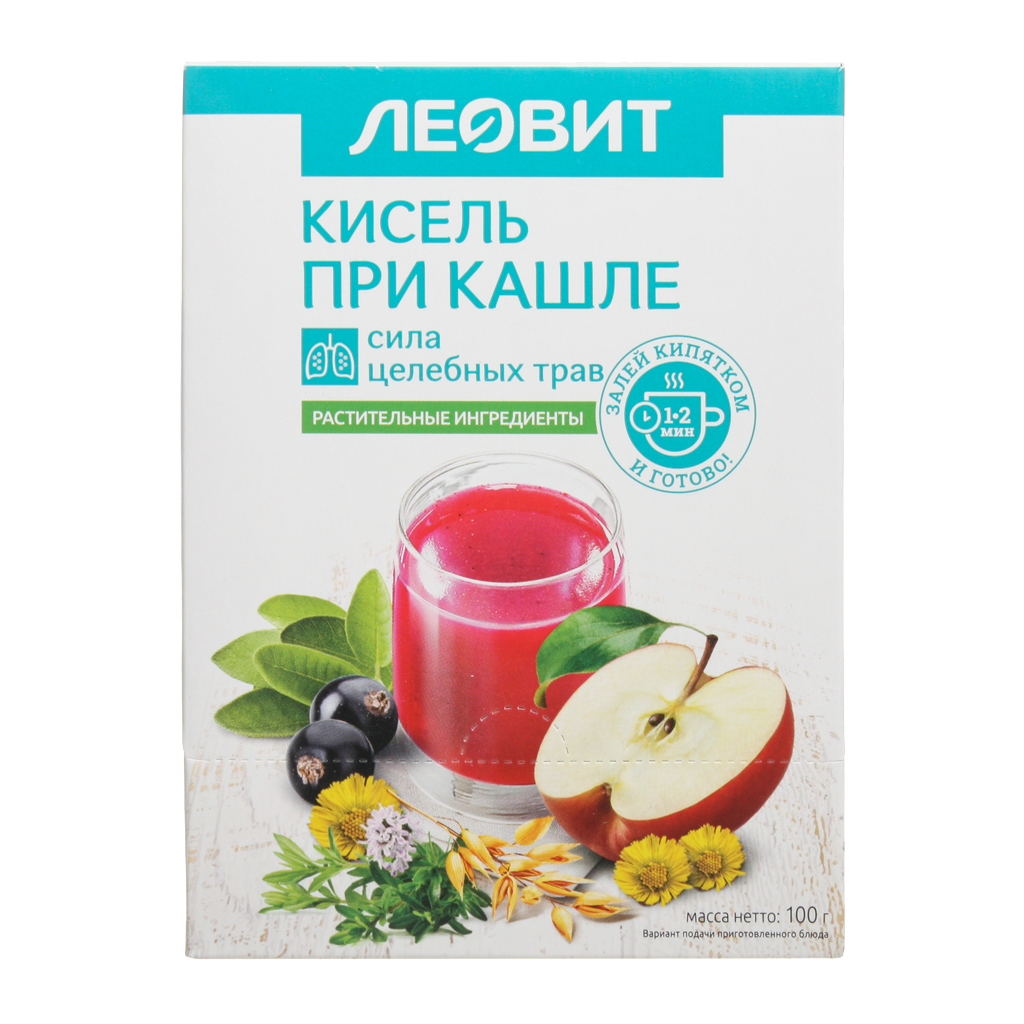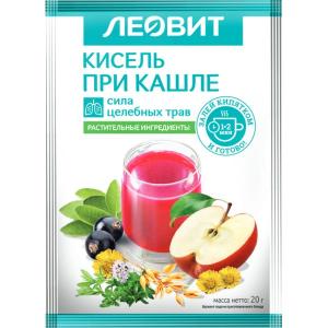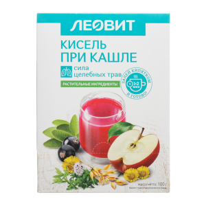 Кисель "При кашле" ЛЕОВИТ - специализированный пищевой продукт диетического профилактического питания при заболеваниях органов дыхательных путей, сопровождающихся кашлевым синдромом, с высоким содержанием витамина С. Содержит также экстракт пармелии, солодку, иссоп, шалфей, чабрец, мать-и-мачеху, имбирь, витамин С, овес, яблоко, свеклу, черную смородину, за счет чего способствует: