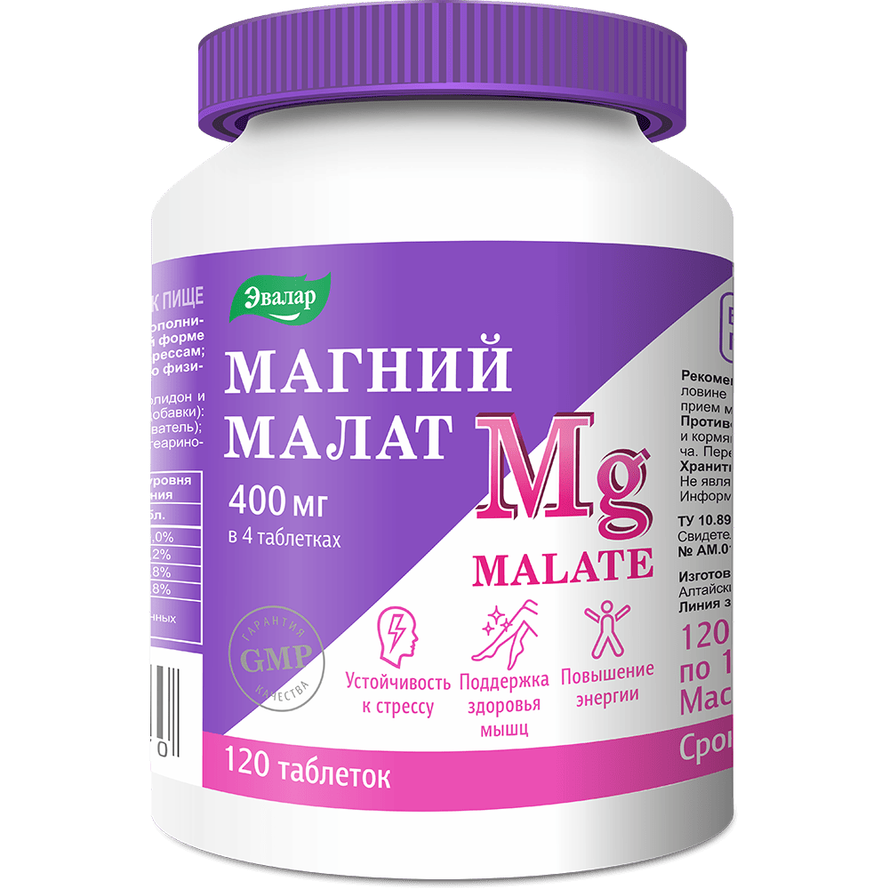 Магний малат – это соединение магния с яблочной кислотой. Яблочная кислота участвует в цикле Кребса, который отвечает за производство энергии в клетках, что повышает физическую выносливость и работоспособность. Именно поэтому в отличие от других форм магния малат рекомендуется принимать утром или в первой половине дня, т.к. он может «бодрить». Малат магния можно применять при болях и судорогах в мышцах, быстрой утомляемости, хронической усталости (т.к. он повышает выработку энергии) и в целом для поддержки нервной системы.