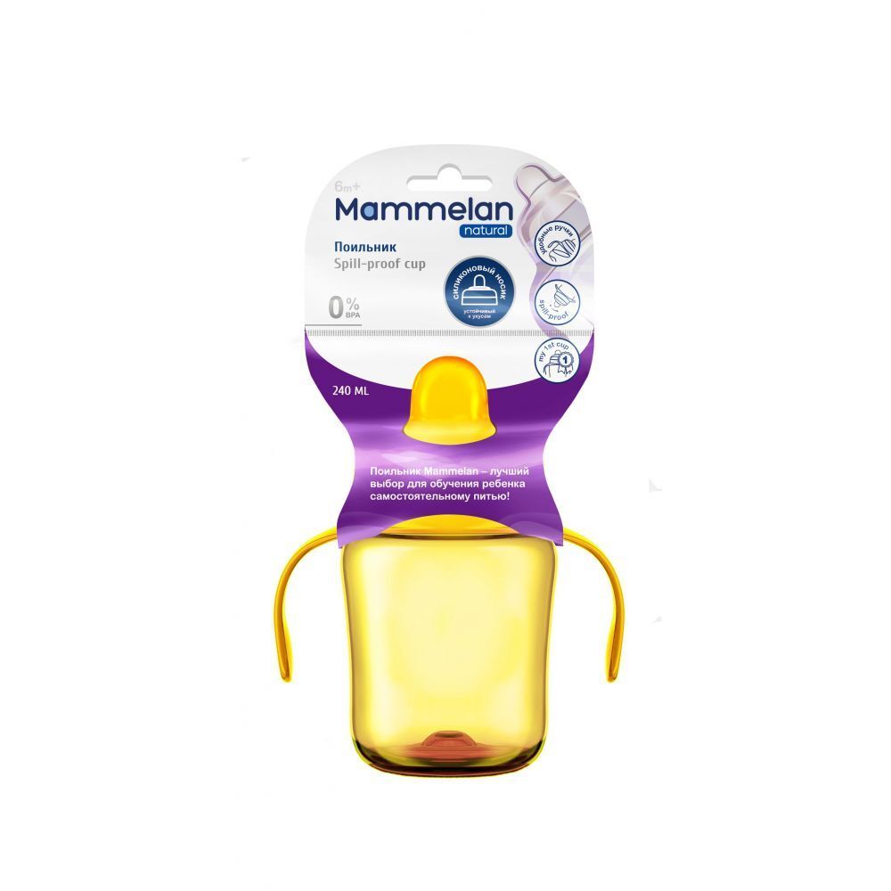 Поильник Маммелан изготовлен из гипоаллергенного и безопасного пластика. Мягкий устойчивый к укусам носик из 100% силикона и эргономичные ручки помогают ребенку научиться пить самостоятельно.