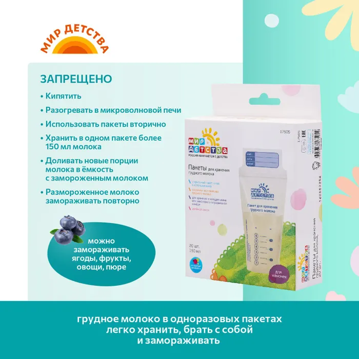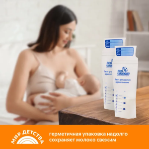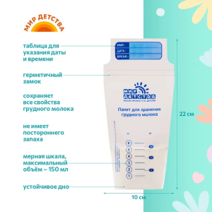 Пакеты «Мир детства» - удобный и безопасный способ хранения сцеженного грудного молока. Незаменимы в случаях, когда кормящей маме нужно ненадолго уехать, а также при лактационном кризе. С пакетами для хранения грудного молока «Мир детства» мама всегда будет спокойна, а малыш сыт и доволен.
