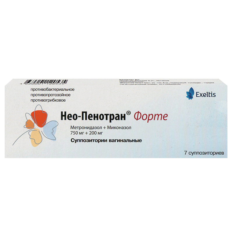 Суппозитории Нео-Пенотран® Форте содержат метронидазол, который оказывает антибактериальное и противотрихомонадное действие и миконазол, обладающий противогрибковым эффектом. Метронидазол представляет собой антибактериальное и противопротозойное средство и является активным в отношении Gardnerella vaginalis и анаэробных бактерий, включая анаэробный стрептококк и Trichomonas vaginalis. Миконазола нитрат обладает широким спектром действия (особенно активен в отношении патогенных грибков, включая Candida albicans — возбудителя молочницы), эффективен в отношении грамположительных бактерий.