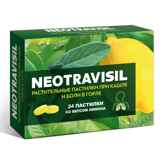 Растительное средство NEOTRAVISIL содержит инновационную комбинацию из 4 экстрактов лекарственных трав: солодки, эвкалипта, камфоры, мяты, а также экстракт плодов апельсина, которые, благодаря комплексному эффекту компонентов, обеспечивают двойное действие: помогают при кашле и боли в горле.