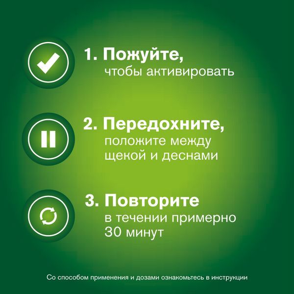 - Жевательную резинку следует разжевывать в течение приблизительно 30 минут с перерывами. Медленно разжевывайте жевательную резинку до появления выраженного вкуса.
