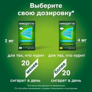 - жевательной резинкой «Никоретте® » 4 мг (повышенное содержание никотина) следует пользоваться, если Вы выкуриваете более 20 сигарет в день или Вам не удалось бросить курить при использовании жевательной резинки в дозе 2 мг.
