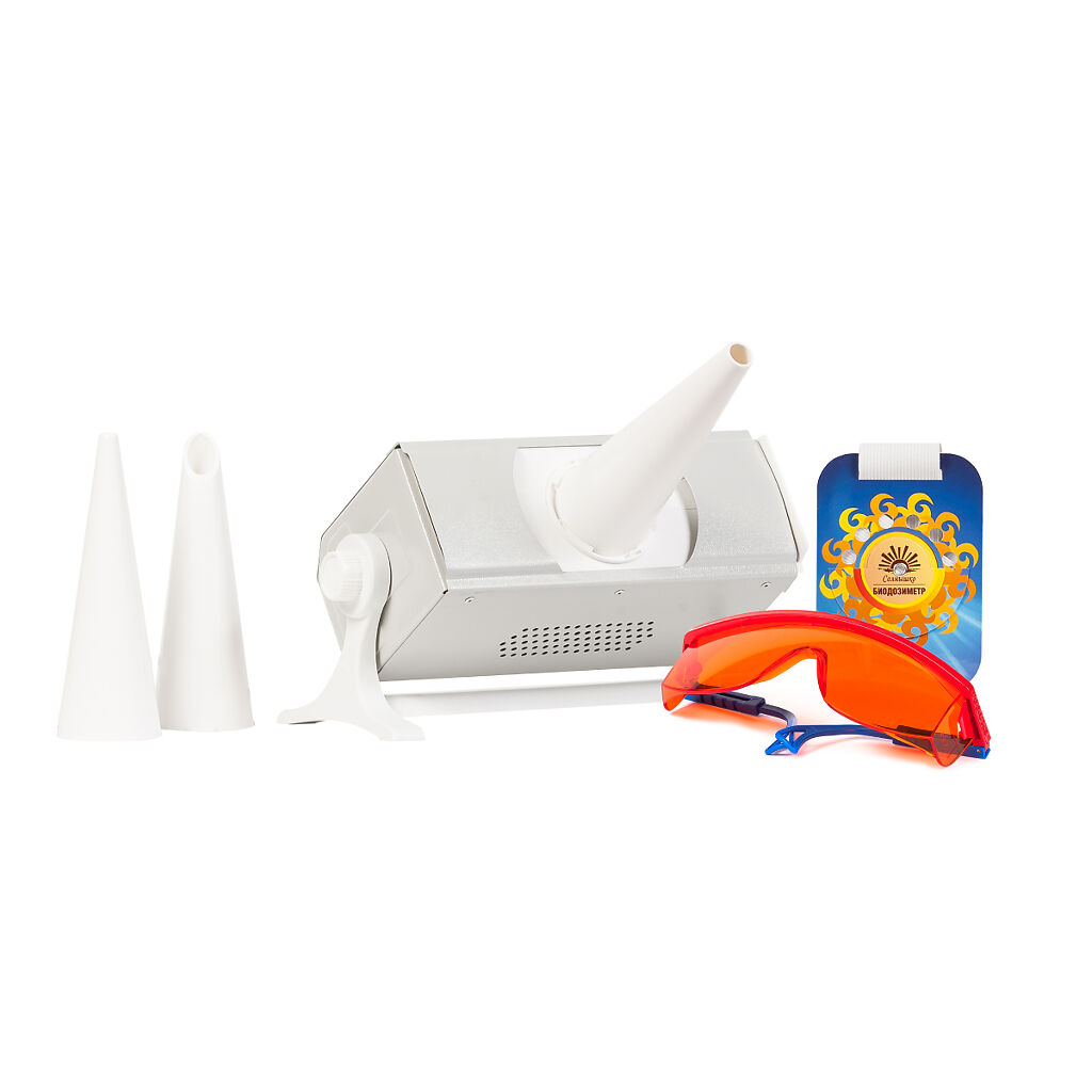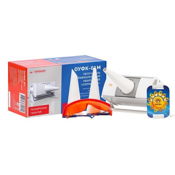 Форма выпуска: облучатель ультрафиолетовый ОУФк-01М "Солнышко", , в упаковке -1 шт. В комплекте с облучателем поставляются 3 вида тубусов, защитные очки и биодозиметр.