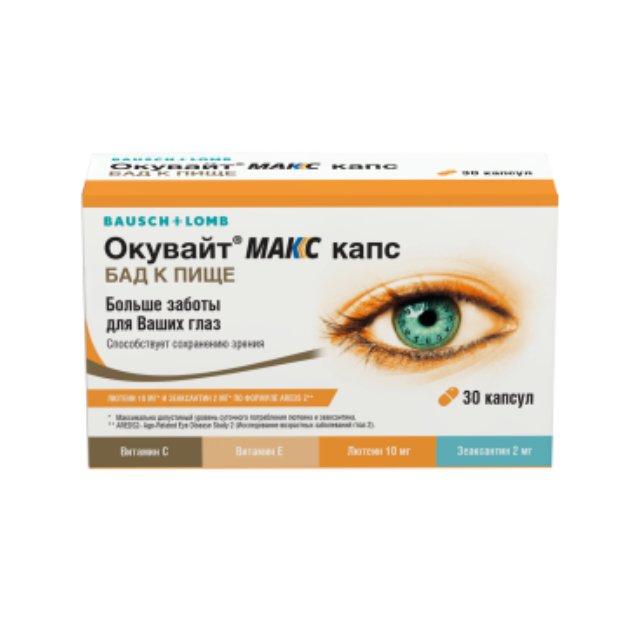 Биологически активная добавка к пище «Окувайт МАКС капс» была специально разработана с учетом данных международного исследования АРЕДС для сохранения здоровья Ваших глаз. «Окувайт МАКС капс» — это источник каротиноидов (лютеина, зеаксантина) и дополнительный источник витаминов С, Е и минеральных веществ — меди, селена, цинка.