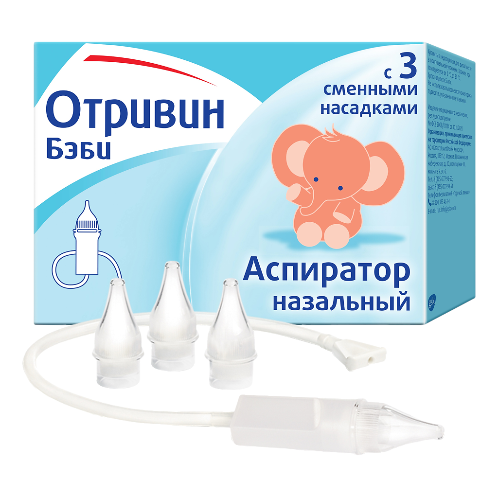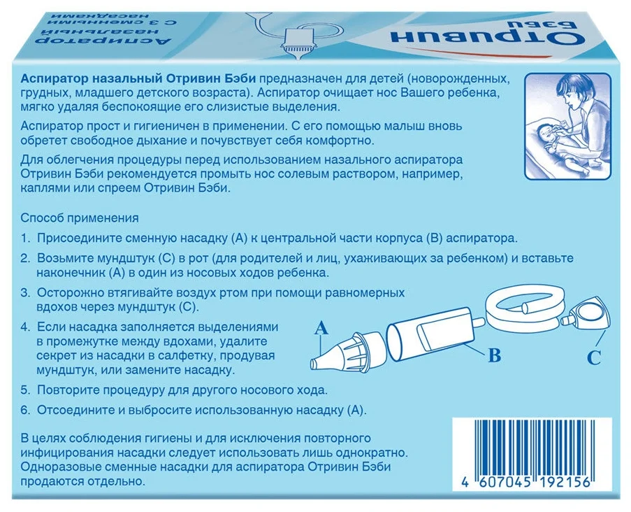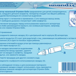 Аспиратор назальный Отривин Бэби предназначен для детей (новорожденных, грудных, младшего детского возраста). Аспиратор очищает нос Вашего ребенка, мягко удаляя беспокоящие его слизистые выделения. Аспиратор Отривин Бэби помогает осуществить мягкое очищение носика малыша от слизи и корочек, ведь до года малыши не умеют сморкаться и нуждаются в помощи взрослых. Удаление слизистых выделений из носа способствует предотвращению осложнений, например, отита, синусита и кашля.