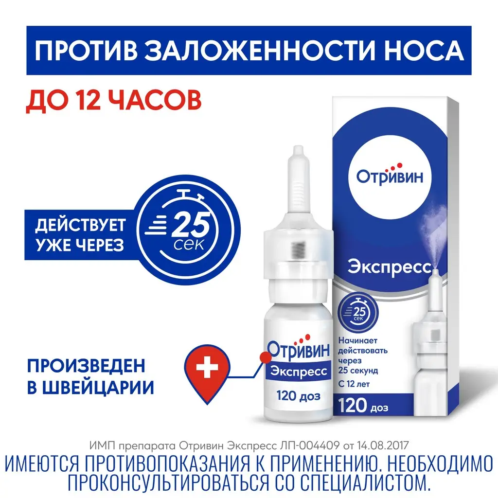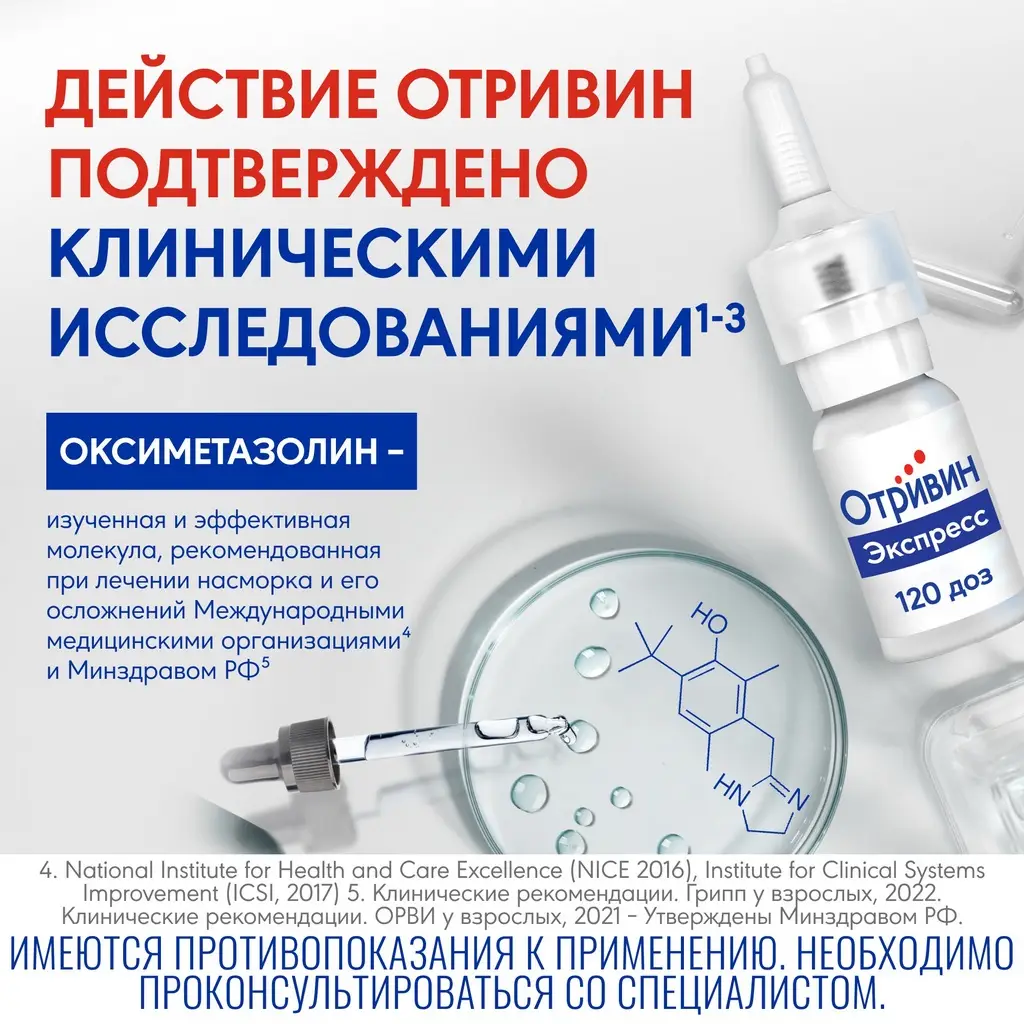 Отривина® Экспресс не следует применять непрерывно на протяжении более 7 дней без консультации с врачом. Длительное или чрезмерное применение препарата может вызвать тахифилаксию, эффект «рикошета» и атрофию слизистой оболочки носа.