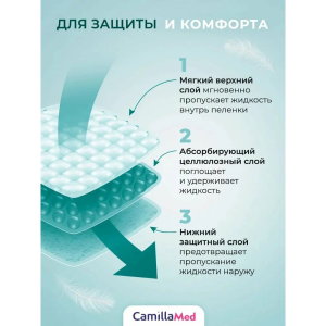 Пеленки CamillaMed предназначены для профессионального ухода за лежачими и малоподвижными больными в лечебно-профилактических учреждениях и домашних условиях. Универсальные пеленки для взрослых людей при нарушении функций выделения тяжелой степени, служат как дополнительная защита различных поверхностей (постель, мебель и т.д.) от намокания. Используются так же при смене подгузников, впитывающих трусов, урологических прокладок при проведении различных процедур. Верхний слой - нетканый материал, нижний слой - полиэтиленовая пленка, что исключает протекание.